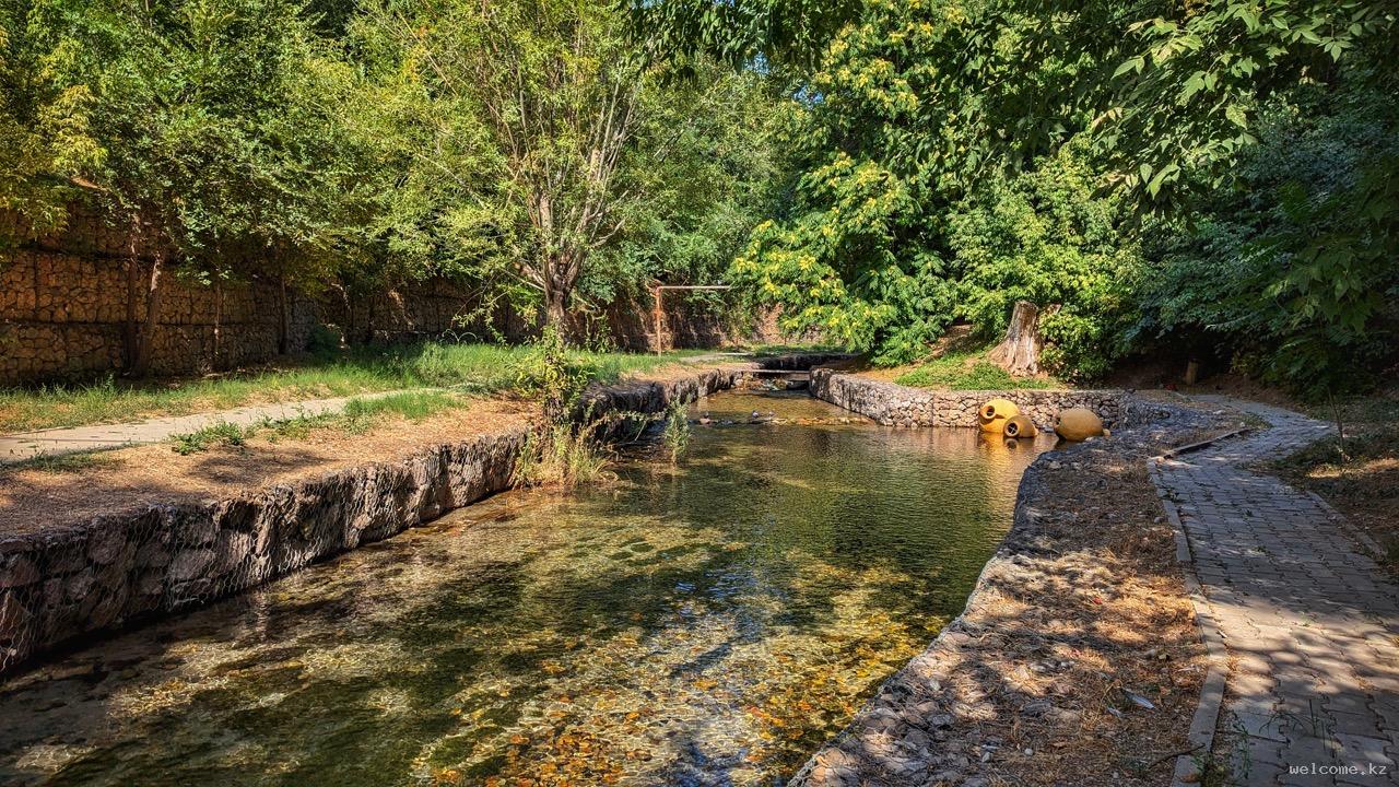 Набережная Кошкар-Ата в Шымкенте — приятное место для спокойных прогулок и отдыха на свежем воздухе у реки с зелёными зонами.